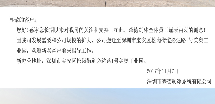 感謝多年來一直陪伴森德制冰成長的全體員工,沒有你們的努力付出,就不會(huì)有森德制冰今日成就。感謝信任和支持森德制冰的合作方,與森德制冰共同發(fā)展。你們見證了森德制冰發(fā)展,由產(chǎn)值不到千萬的小企業(yè),經(jīng)過短短幾年發(fā)展,產(chǎn)值達(dá)近5000萬制冰設(shè)備服務(wù)商,成為制冷行業(yè)發(fā)展最迅猛的企業(yè)。因原來老廠房設(shè)施破舊,不管是小小的航吊還是廠房面積均不能滿足現(xiàn)有的發(fā)展需求。公司股東研究決定擴(kuò)大生產(chǎn)規(guī)模,搬遷至更能適合生產(chǎn)大型制冷設(shè)備的承重航吊廠房。公司由原來地址:深圳市寶安區(qū)松崗街道沙浦沙二工業(yè)區(qū)原雙木林院內(nèi),搬遷至新地址:深圳市寶安區(qū)松崗街道燕川必達(dá)路1號美奧工業(yè)園。新地址公司相關(guān)人員已 送至合作方。特此通知,如有不便還望海涵