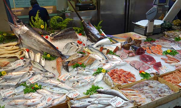 4. 將魚陳列好后,要在魚身上再薄薄地撒上一層冰,防止商品的風干,降低商品的溫度和水分。注意不宜多撒,如果撒多了把魚埋住,一不能很好地展示商品,二由于冰水逐漸融化,上下的冰層會把魚包裹在中間,影響魚的鮮度。